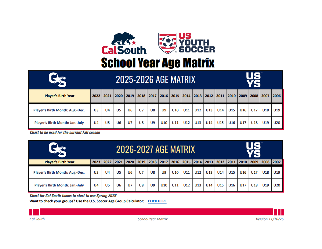 Citizen FC teams follow the US Youth Soccer School Year Age Matrix used by Cal South, grouping players by school year so teammates and classmates can develop and compete together.