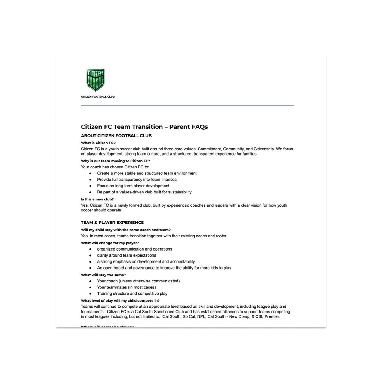 Clear answers to common parent questions—including team continuity, costs, travel expectations, and how Citizen FC supports players and families.